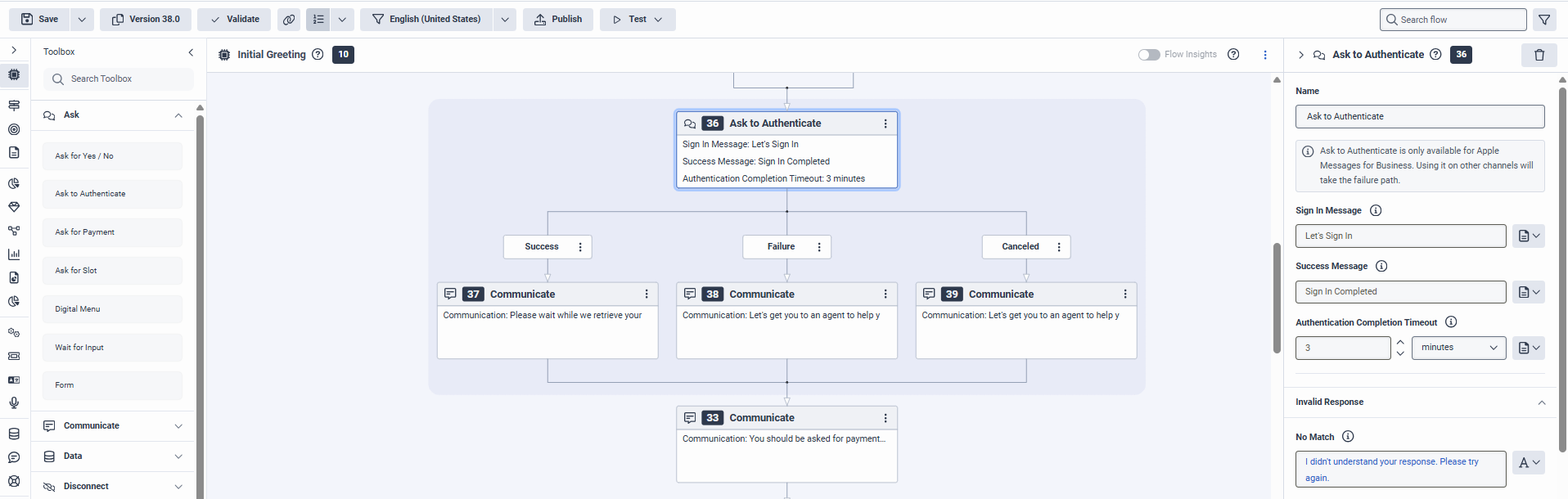 Genesys Cloud は、Apple Messages for Business のインタラクションで OAuth2 ベースの認証をサポートします。ボット作成者は、デジタル ボット フロー内で直接、安全な認証アクションを追加できるようになります。この機能により、顧客はエージェントのトランスクリプトに機密情報を公開することなく、会話中に自分の身元を確認できます (たとえば、口座残高を確認したり、取引を完了したりできます)。