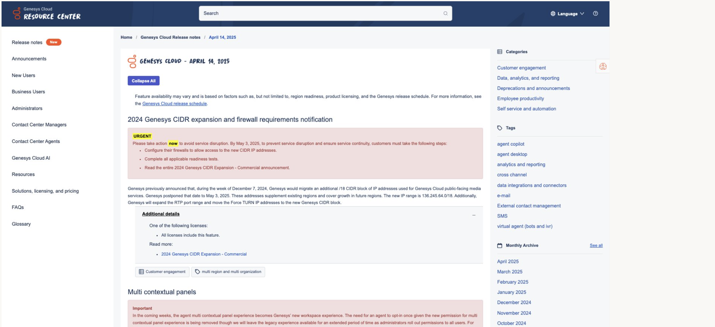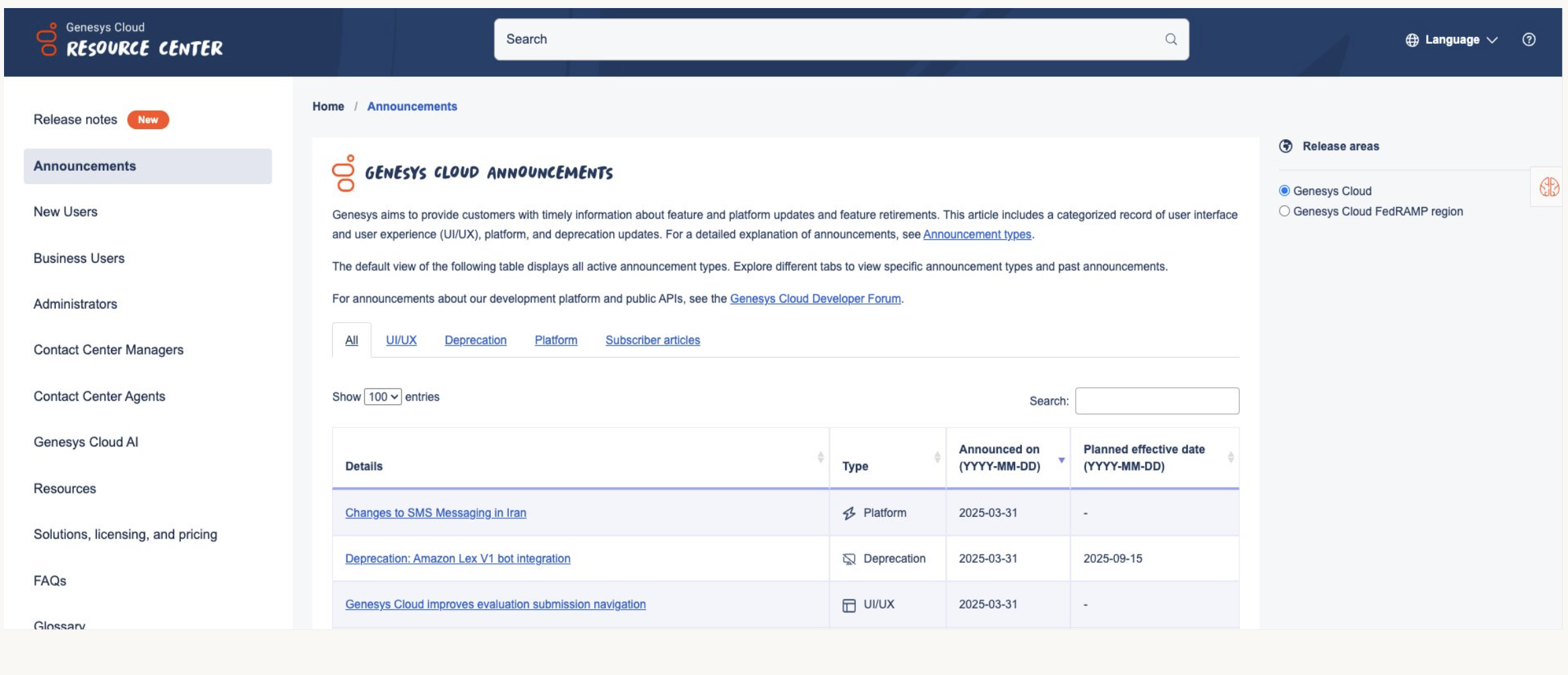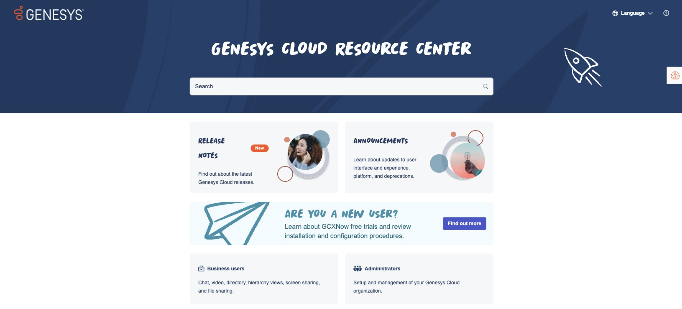 今後のリリースでは、Genesys Cloud Resource Centerはヘルプ.genesys.cloud 。 このアップデートにより、リソース センターが Genesys Cloud ブランドと整合され、サイト全体のナビゲーションが改善され、リリース ノートの使いやすさが向上し、ローカリゼーション サポートが改善されます。