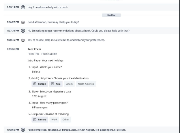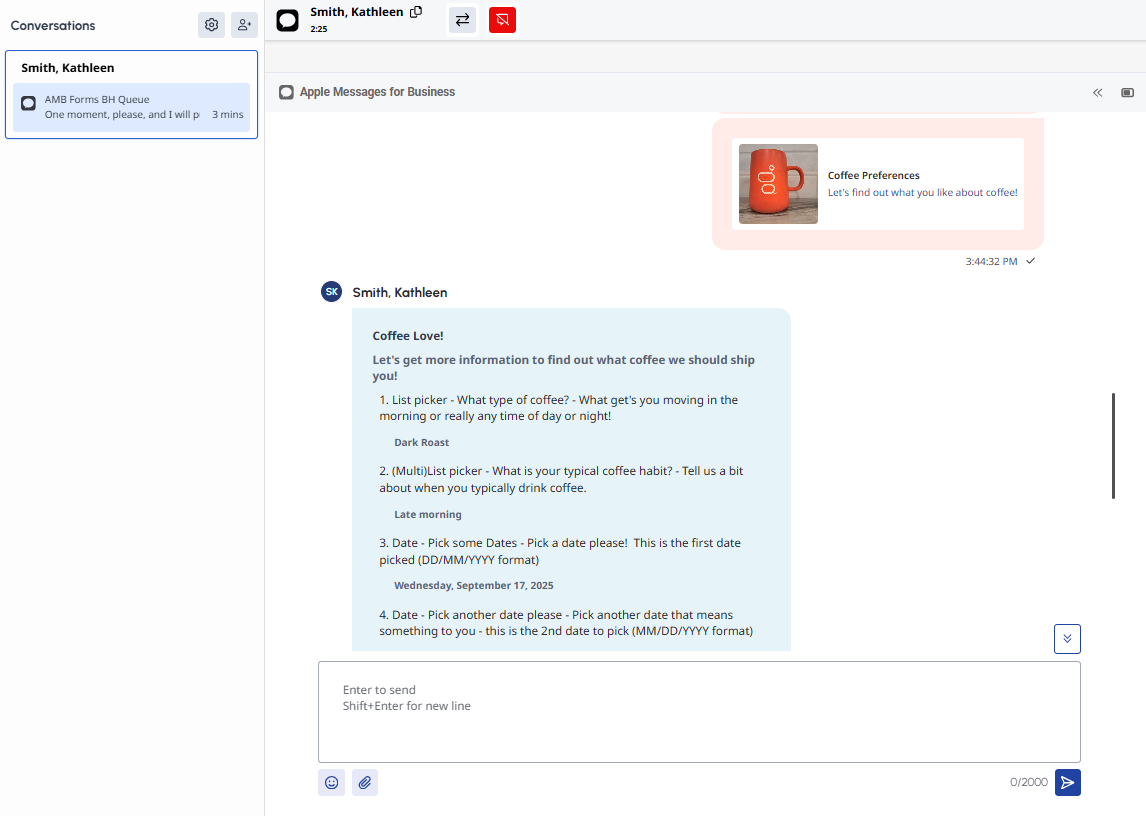- 顧客が送信したフォームの回答メッセージのトランスクリプトに表示され、エージェントはやり取りをシームレスに把握できます。