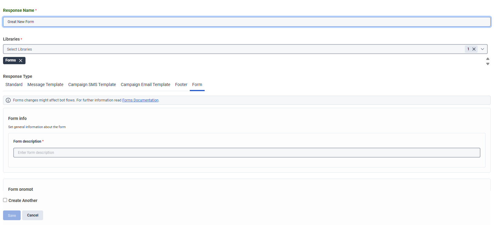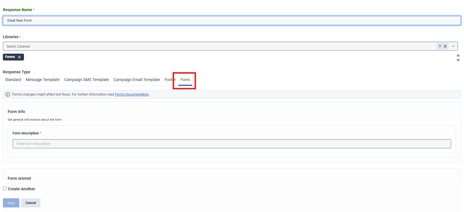 - 定型応答の新しいフォーム タブ。 専用のフォーム タブが、定型応答インターフェース内に表示されます。管理者はこのタブを使用して、次のページ コンポーネントを選択して配置し、フォーム メッセージを構成します。