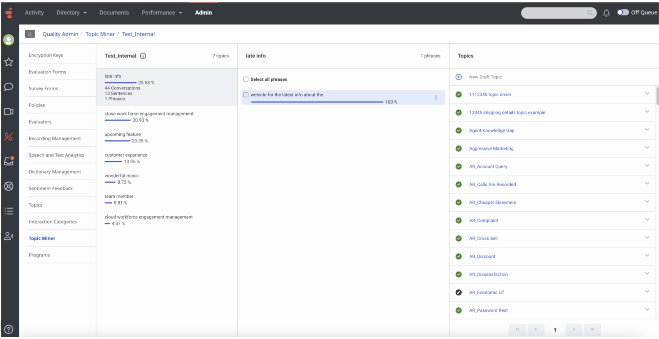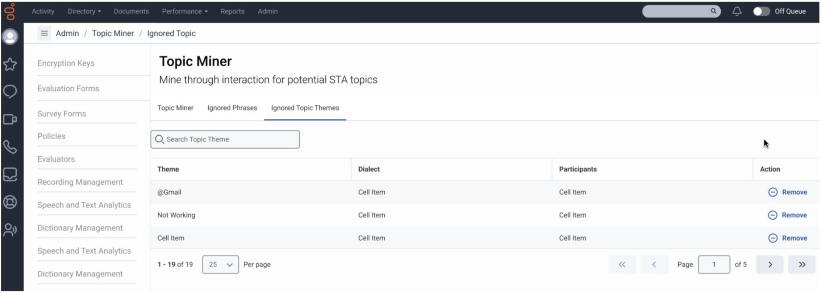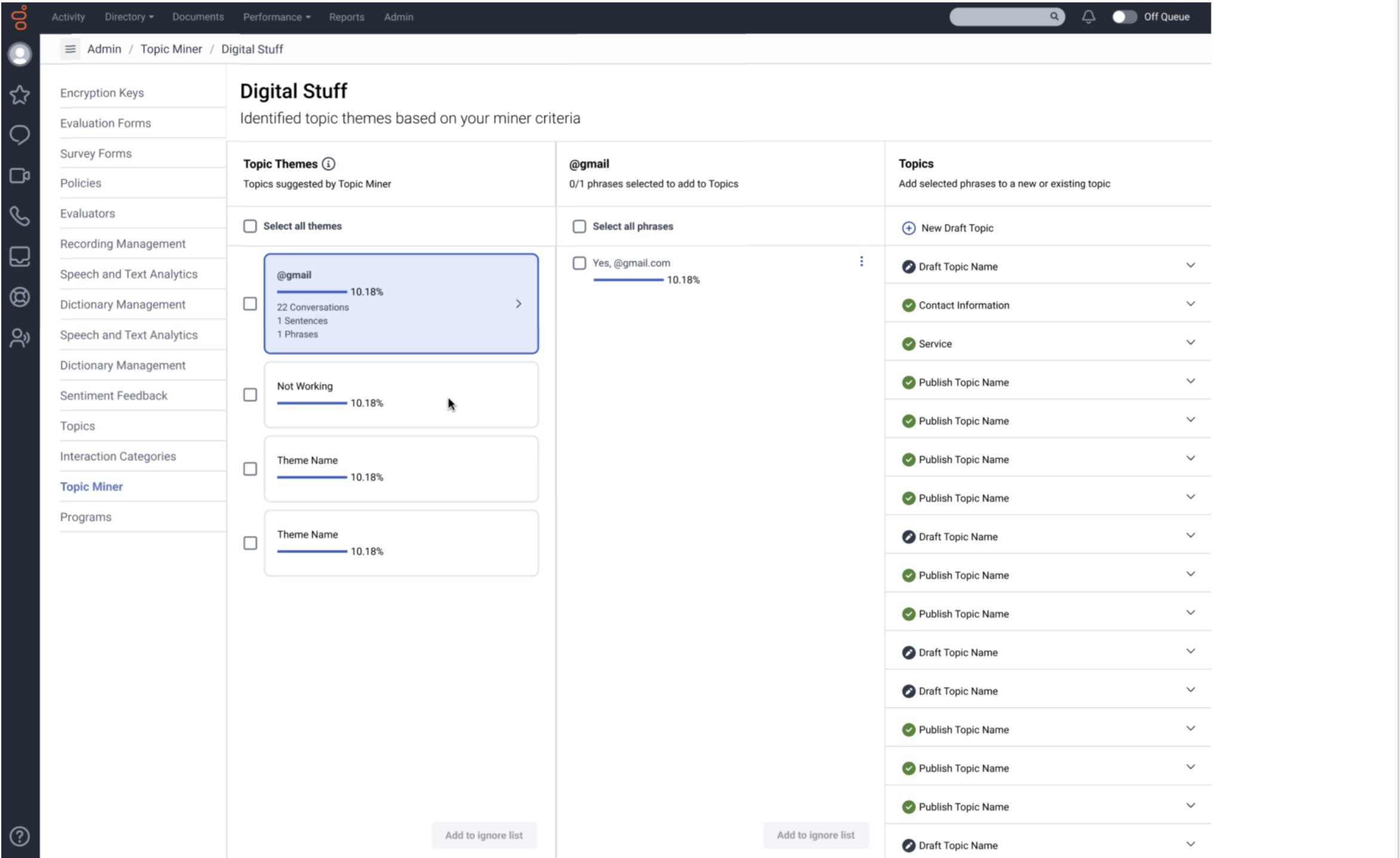 今後のリリースでは、Genesys Cloud はトピック マイナーに新しい機能を導入し、ユーザーが不要なトピックやフレーズを無視できるようにすることで、マイニング結果の関連性を高め、管理しやすくします。これらの変更により、繰り返しが削減され、マイニング ワークフローが合理化されます。