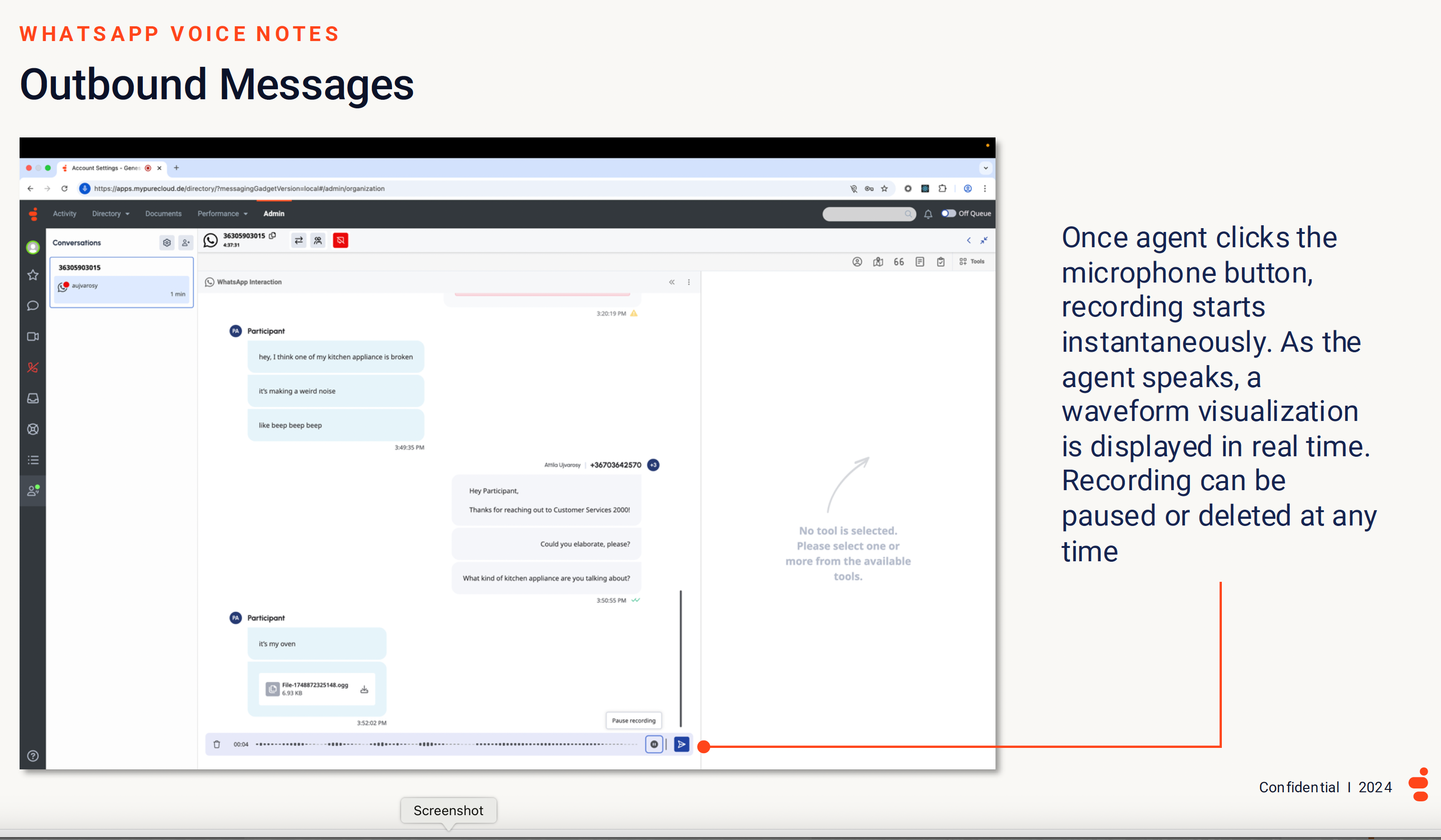以前は、エージェントはテキストを使用してのみ WhatsApp メッセージに返信できました。顧客が音声メッセージを送信した場合、エージェントは手動でファイルをダウンロードして聞く必要があり、音声メッセージで返信することはできませんでした。