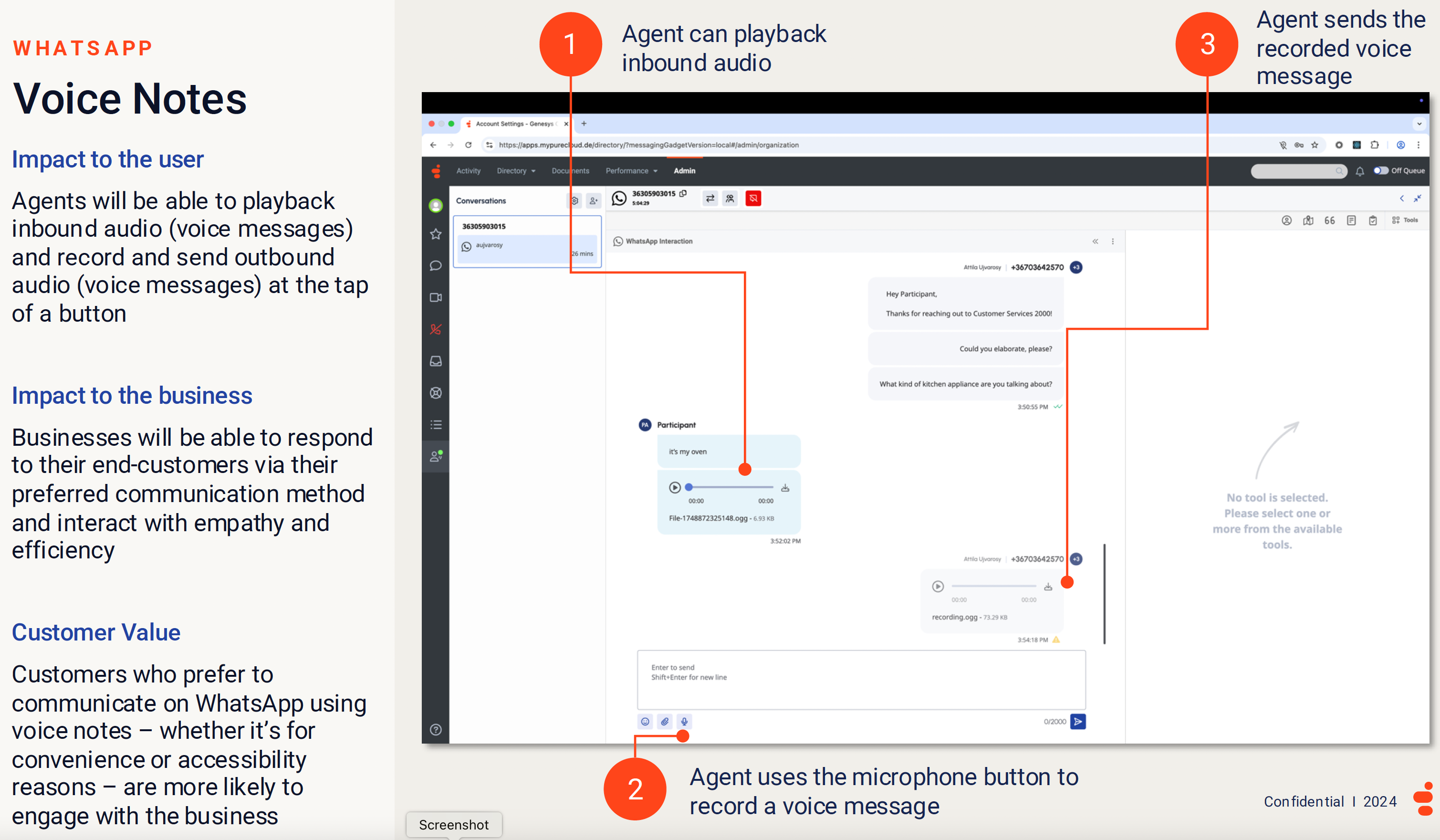 今後のリリースでは、Genesys Cloud は WhatsApp 上のエージェントと顧客間の音声メモの交換をサポートし、よりアクセスしやすく共感的なコミュニケーションを可能にします。この機能により、Genesys Cloud ユーザーは、顧客の好みのコミュニケーション モード (音声) で顧客と会うことができます。
