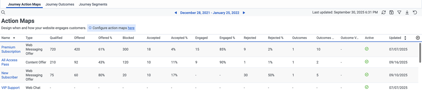 - 組織内で構成されているすべてのアクション マップとその全体的な有効性。