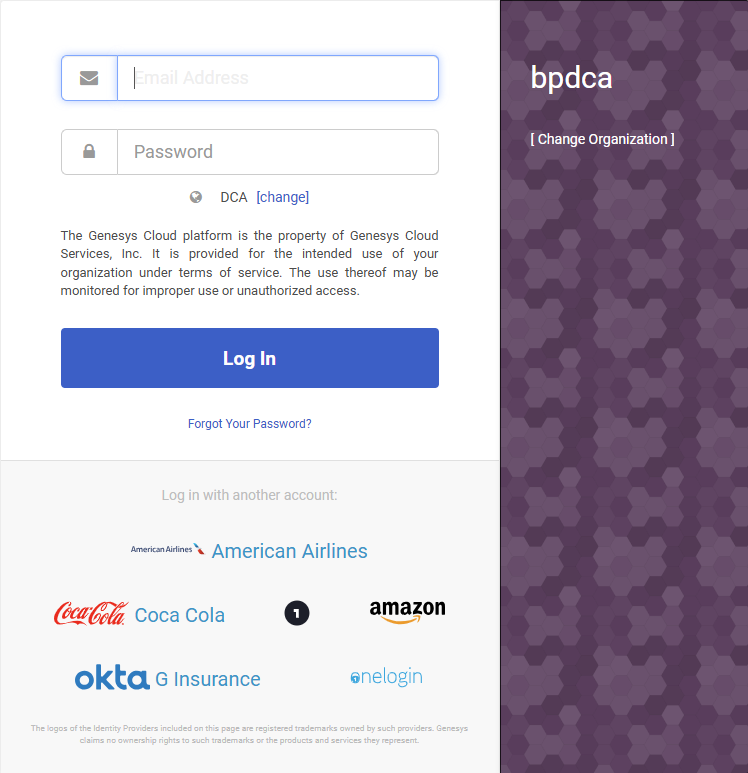 - Genesys Cloudログインページにロゴを表示するには、ログインページでの表示名。注記:6 つ以上の ID プロバイダーがある場合、「ログイン ページに名前を表示」オプションは使用できません。