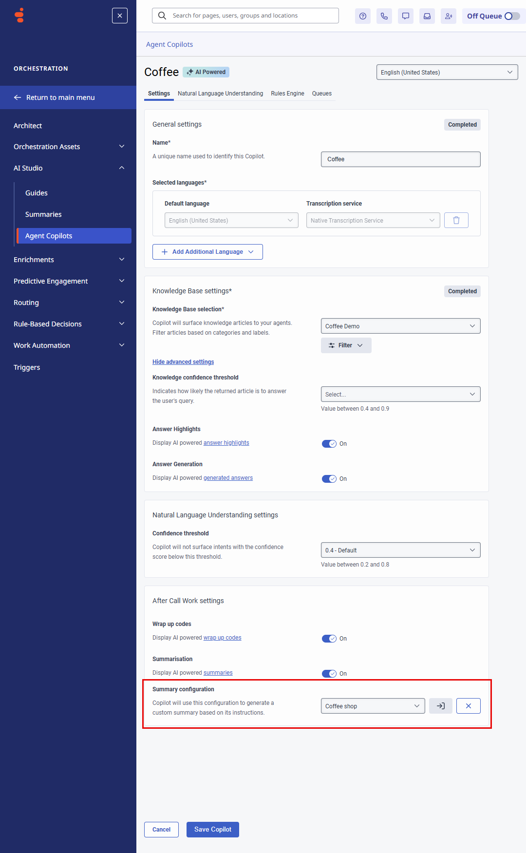 AI Studio サマリー構成を Agent Copilot に割り当てる前に、まず AI Studio ビューでそれを追加する必要があります。詳細については、 AI Studio の概要を追加および管理する。