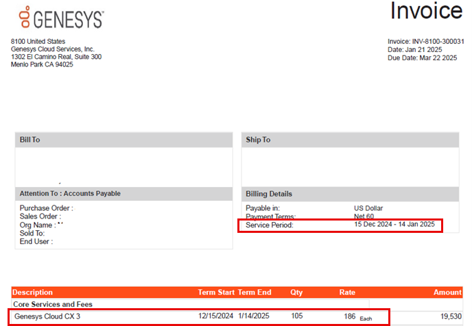 - 請求は延滞金に切り替わり、Genesys はサービス提供月の終了後に請求します。