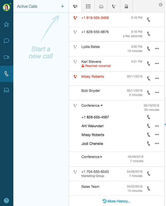 [通話]パネルでは、組織内の他のユーザーまたは組織外の番号に電話をかけることができます。 また、通話履歴の確認や留守番電話の聴取、電話機の選択も可能です。