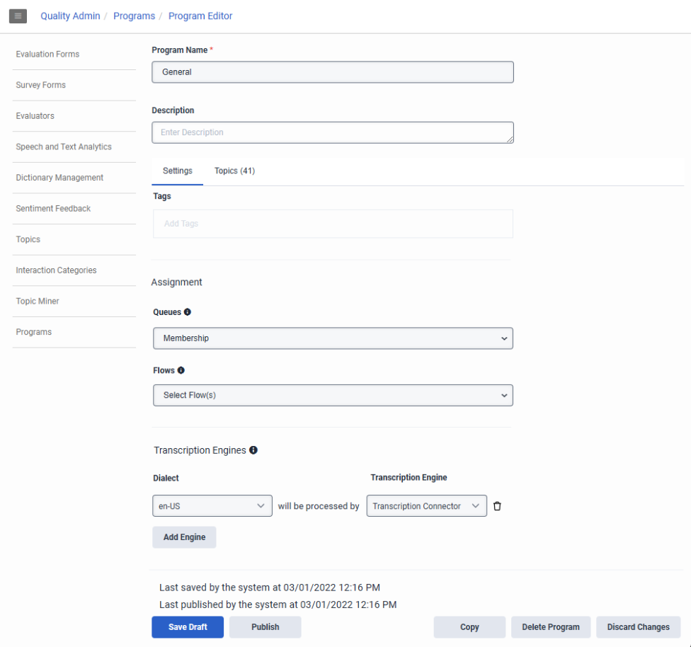 管理者は、プログラム内の特定の方言に使用するトランスクリプション エンジンを選択できます。この手順は、拡張音声文字変換サービスまたは文字変換コネクタが統合として有効になっている場合にのみ実行できます。