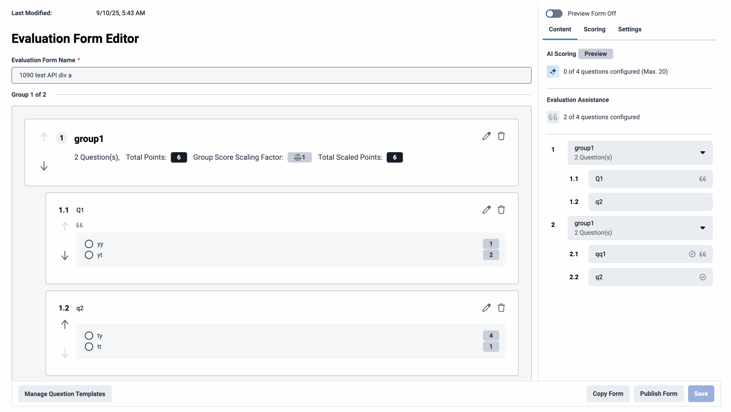 Genesys Cloudは、保存および公開された評価フォームのバージョンを保存します。 保存された評価フォームは編集できますが、公開された評価フォームは編集できません。 ただし、最後に公開されたバージョンに基づいて新しい評価フォームを作成できます。