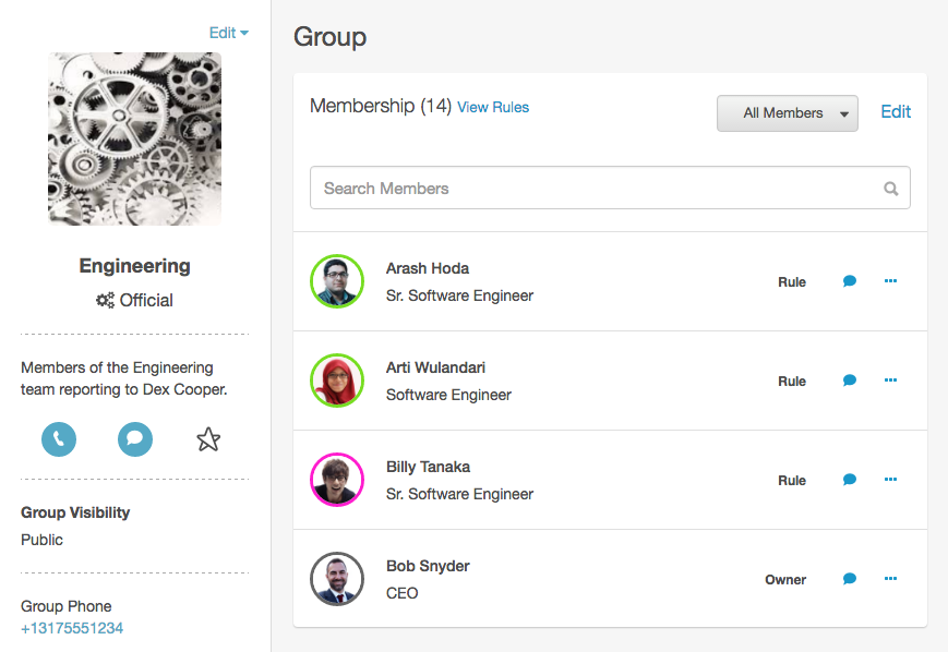 グループプロファイルページでは、組織内のグループ の詳細が表示されます。 各グループのプライバシー設定は、特定の詳細を見てから、またはすべてでグループを見てからあなたを防ぐことができます。