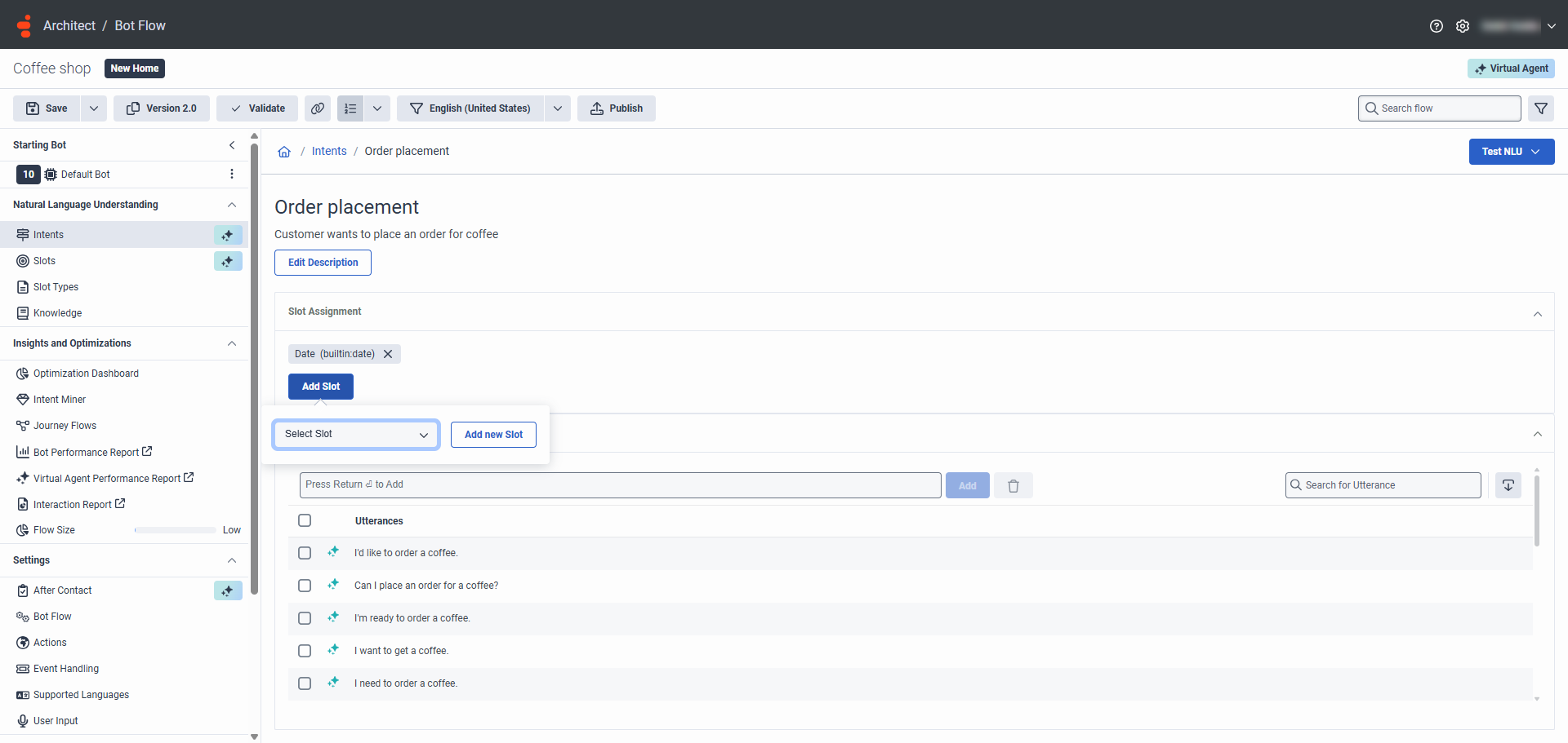 - 下 発話、発話の特定の用語をクリックします。 [スロットの選択]リストが表示されます。