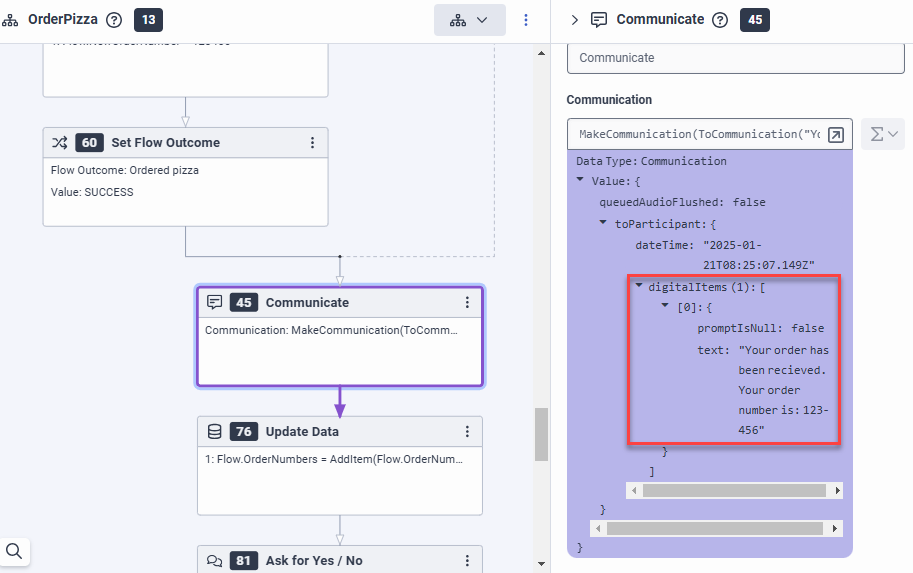 If(FindFirst(Flow.OrderNumbersDatabase, ToJSON(Task.CheckNumber))==-1, false, true)既存の注文番号の配列がFlow.OrderNumbersDatabase変数には顧客が入力した注文番号が含まれます(Task.CheckThisNumber)。