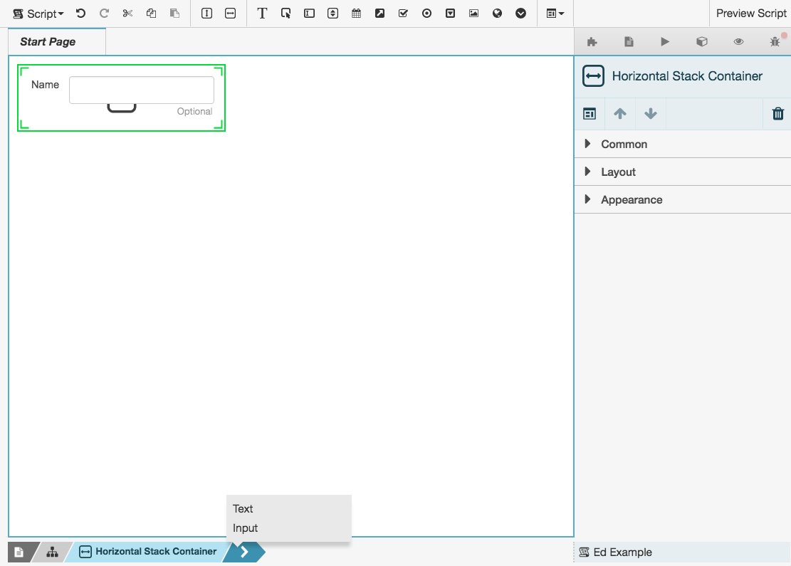 このパネルには、ページのプロパティ、より一般的には現在選択されているコンポーネントのプロパティが表示されます。 プロパティはコンポーネントによって異なるため、各コンポーネントの追加方法を説明するヘルプトピックに記載されています。 見る スクリプトコンポーネントを追加する コンポーネントトピックのリストについては。 コンポーネントのプロパティは、関連するアイテムを表示するためにグループ化されています。 ほとんどのコンポーネントの一般的なグループは次のとおりです。