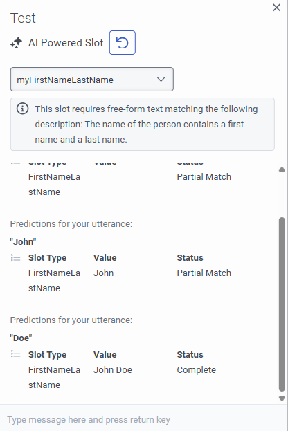 AI 搭載スロットのテスト ウィジェットを使用すると、カスタム AI 搭載スロットを試して、仮想エージェントによってスロットがどのようにキャプチャ、収集、修正されるかを理解できます。ウィジェットは、マルチターン (部分的) スロット収集と修正のテストをサポートします。