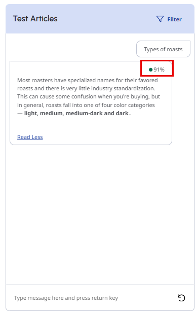 検索結果は常に、ナレッジベースによって割り当てられた信頼番号で並べ替えられます。 知識ベースによって割り当てられた信頼度番号は、チャットの返信の上に直接表示されます。 しかし、最も信頼度の高い記事が、お客様の求める答えであるとは限りません。 質問と回答のクエリーをテストし、修正することで、代理店と顧客の検索結果を改善します。