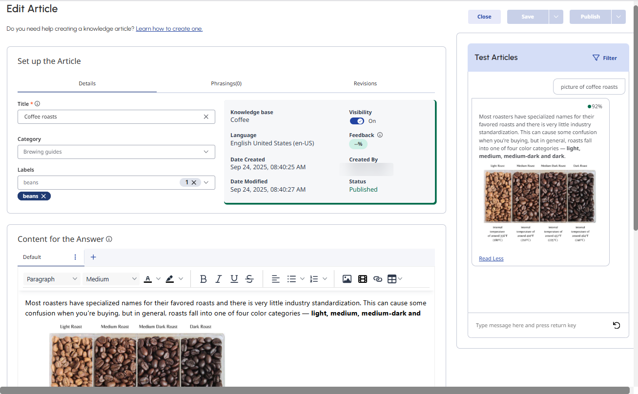 知識ベースを追加すると、新しい質問と回答の記事を追加することができます。 ナレッジベースと質問・回答記事を作成したら、お客様のために知識を表面化させることができます。