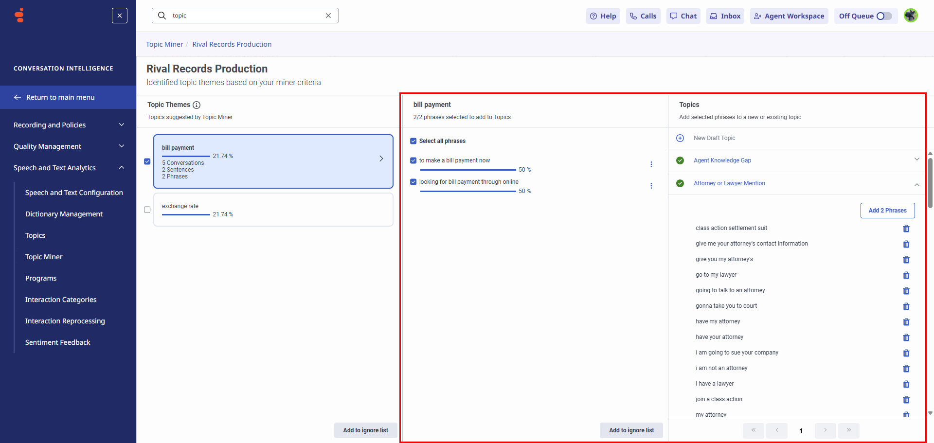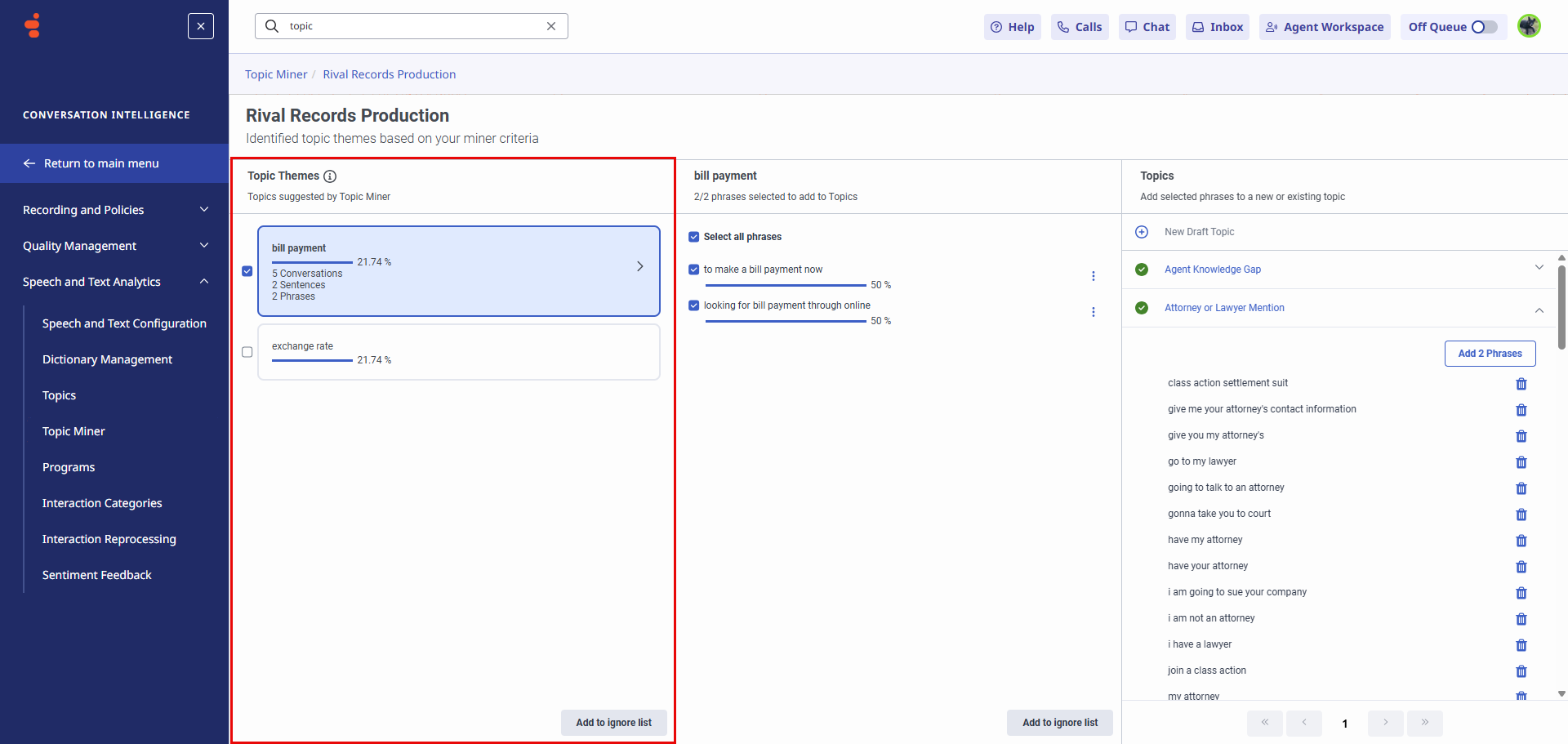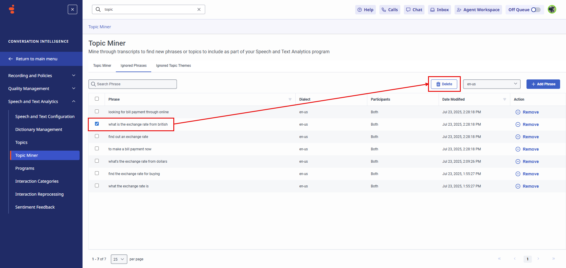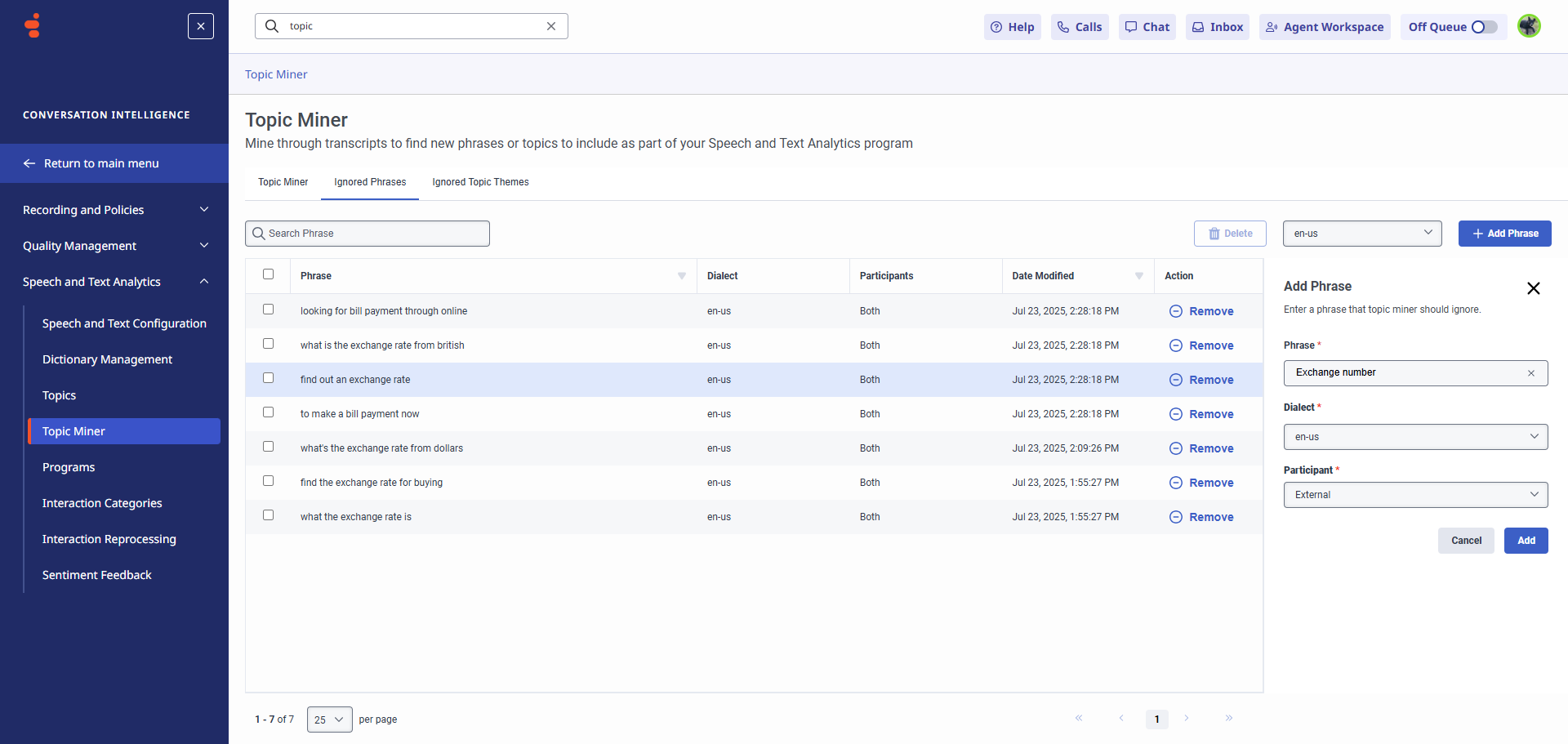 Genesys Cloud は、関連するすべてのフレーズをフレーズ無視リストに自動的に追加します。エージェント、顧客、または会話の両側で無視されたトピックを管理できます。