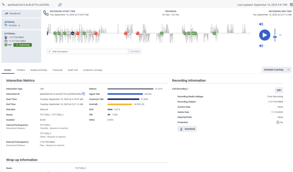 NS 詳細 タブは、インタラクションに関する情報を表示するための中央の場所を提供します。 NS 詳細 タブには、インタラクションメトリック、記録情報、まとめ情報、参加者データ、およびSIP診断が要約されています。 詳細については、以下の詳細セクションを参照のこと。