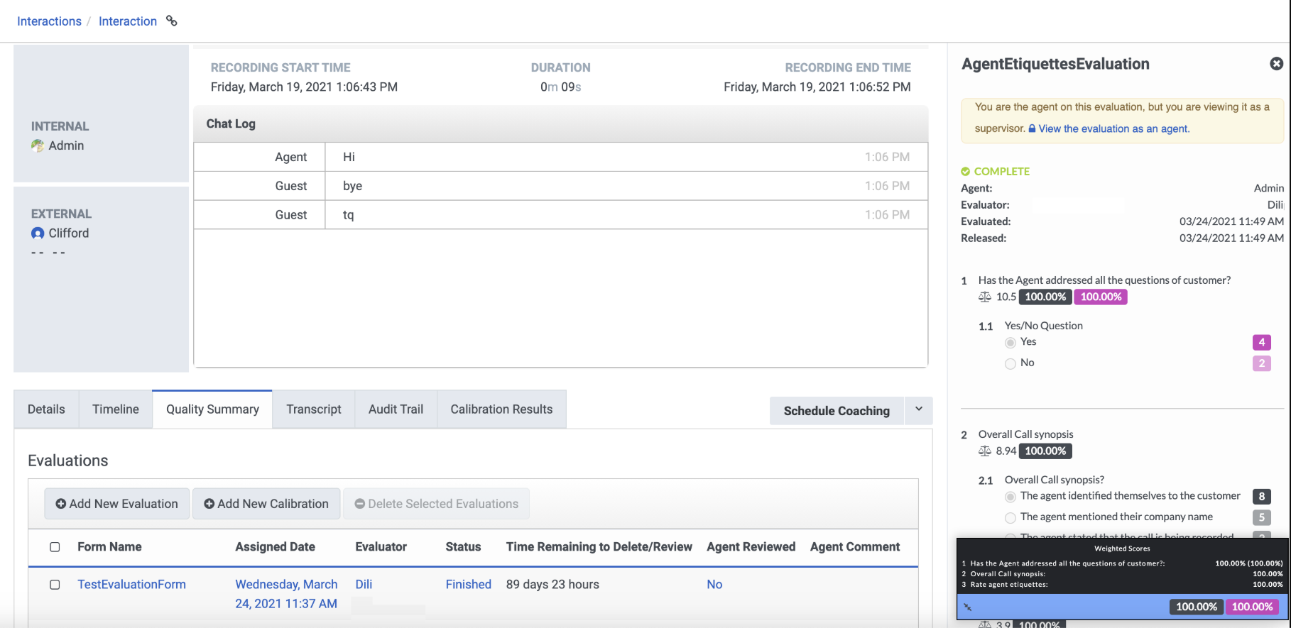 からインタラクション詳細ページ]で、 品質概要 タブをクリックして、インタラクションに関連する評価を表示します。