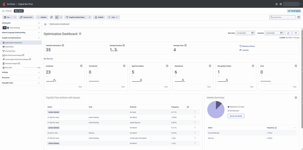 ダッシュボードは、改善すべき分野を見直すための一箇所を提供する。 また、ダッシュボードは、フローや会話の重要な部分に直接リンクし、問題を解決することができるため、音声やデジタルボットのフローをより簡単に最適化することができます。 アーキテクト > [選択したボットフローまたはデジタルボットフロー]>インサイトと最適化 メニューからダッシュボードにアクセスし、この重要な情報を表示します: