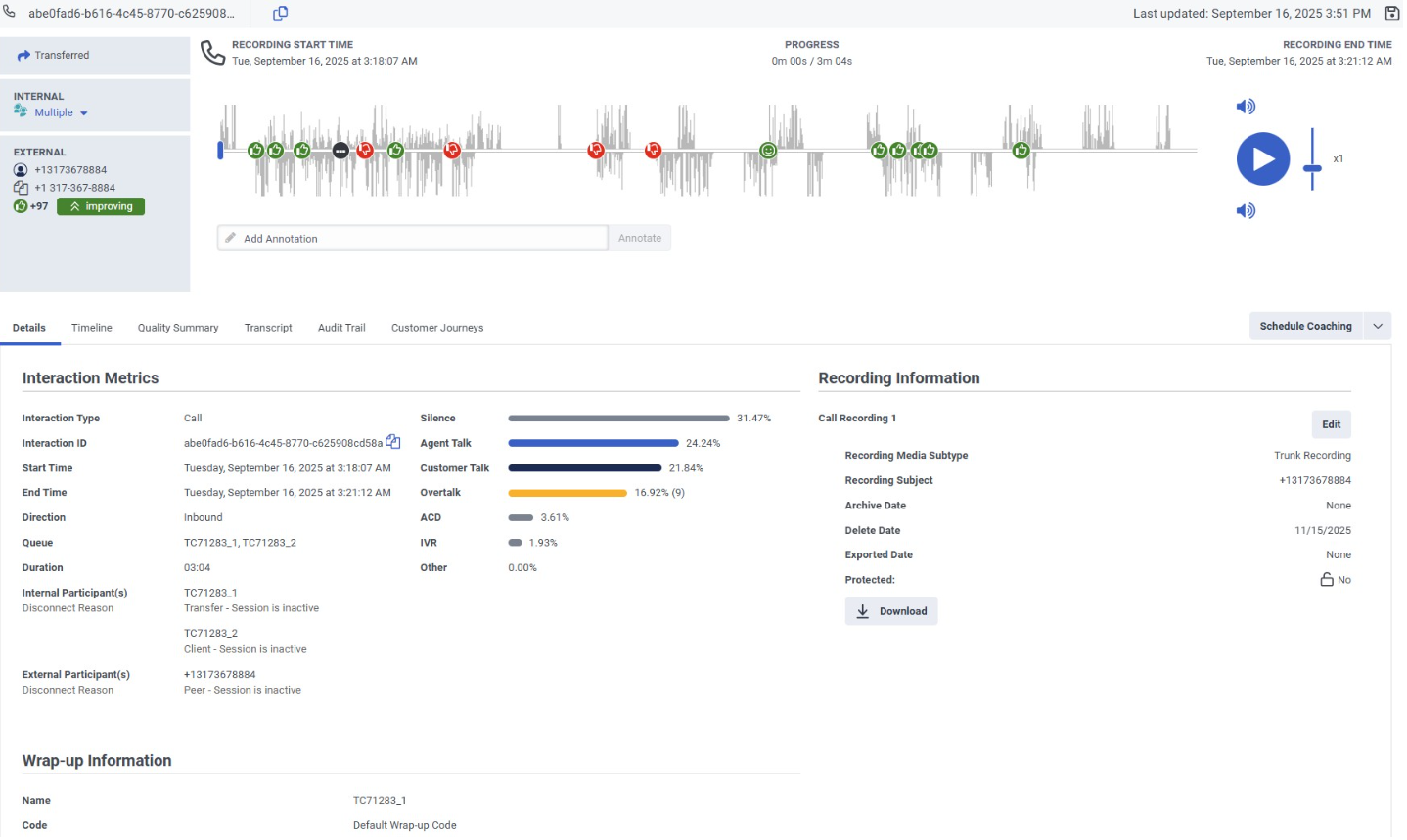 インタラクションの詳細ページは、そのインタラクションに関する詳細情報を表示し、それに関連するタスクを完了するための中心的な場所です。 インタラクションの詳細ページには、インタラクションの概要これはインタラクションの視覚的な表現であり、タブ付きのページにインタラクションの詳細が表示されます。