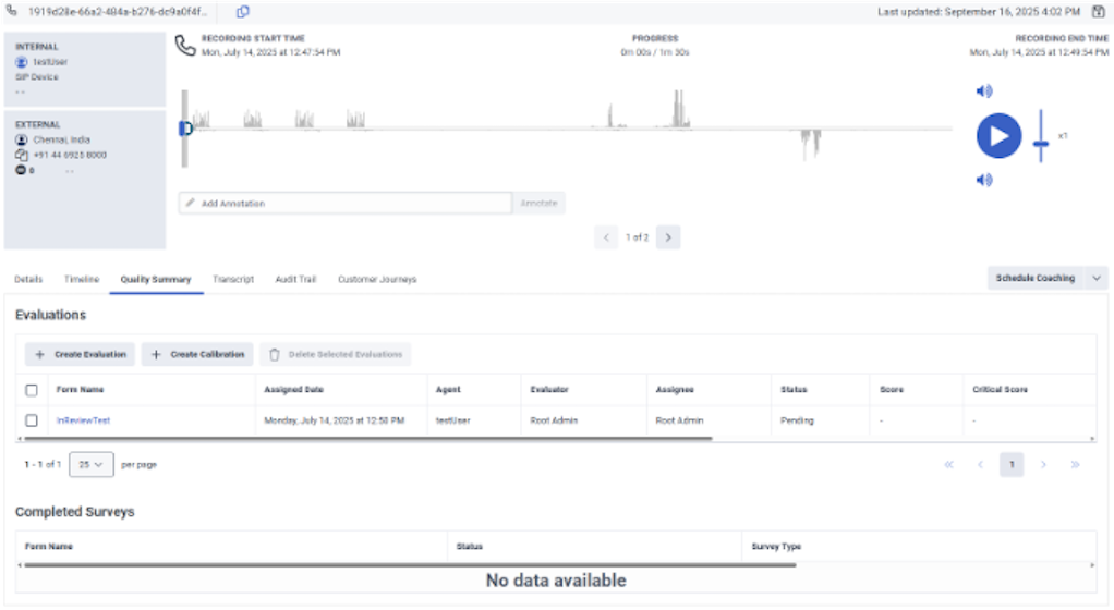 インタラクションの詳細ページから、品質サマリーをクリックし、インタラクションに関する既存の評価およびアンケートデータを表示するためのタブをご覧ください。