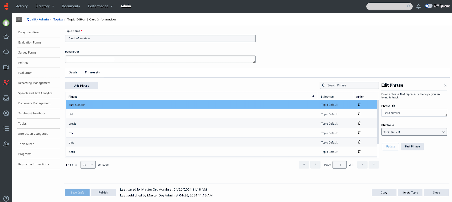 - から厳格さリストで、別の厳密さを選択するか、現在の厳密さを維持します。注記:厳密性のレベルは、システムがトピックのフレーズを認識するための自信の程度を定義します。例えば、フレーズやトピックに「低(65)」を選択した場合、トピックフレーズは信頼度が65以上でないと識別されません。システムが信頼度 55 でフレーズを認識し、トピックの厳密さが低 (65) に設定されている場合、そのフレーズは見つからないとマークされ、そのインタラクションのトピックには関連付けられなくなります。ただし、システムによって返される厳密度が 65 を超える場合、フレーズは見つかったとマークされ、そのインタラクションのトピックに関連付けられます。。