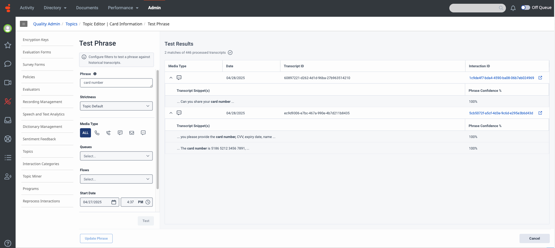 - フレーズ信頼度パーセンテージ注記: 各結果を展開して詳細を表示できます。インタラクションIDをクリックすると、新しいタブで完全なインタラクションのトランスクリプトが開きます。/bs_well]