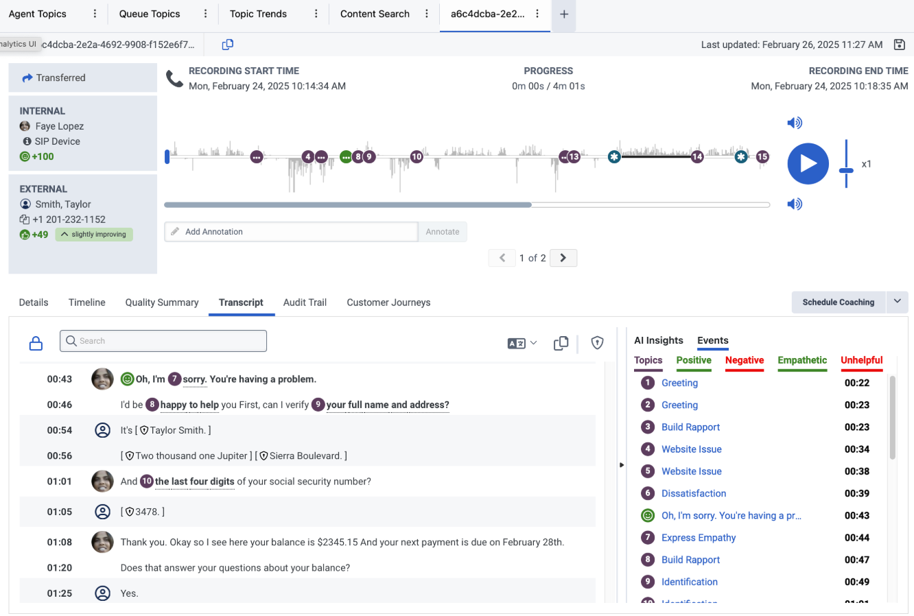 Transcript タブでは、外部(カスタマー)と内部(IVR、ACD、エージェント、会議、またはボイスメール)の参加者間の会話を、話 者別に書き起こします。 トランスクリプトは、インタラクションで何が行われたかの洞察を提供し、ユーザーがビジネスの問題と機会の領域を発見できるようにします。