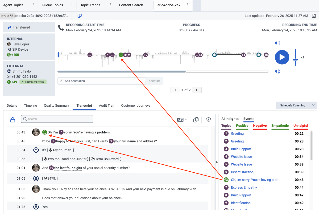 メモ: 注: インタラクション概要波形とイベントパネルでセンチメントマーカーをクリックすると、インタラクション記録でセンチメントマーカーが強調表示されます。