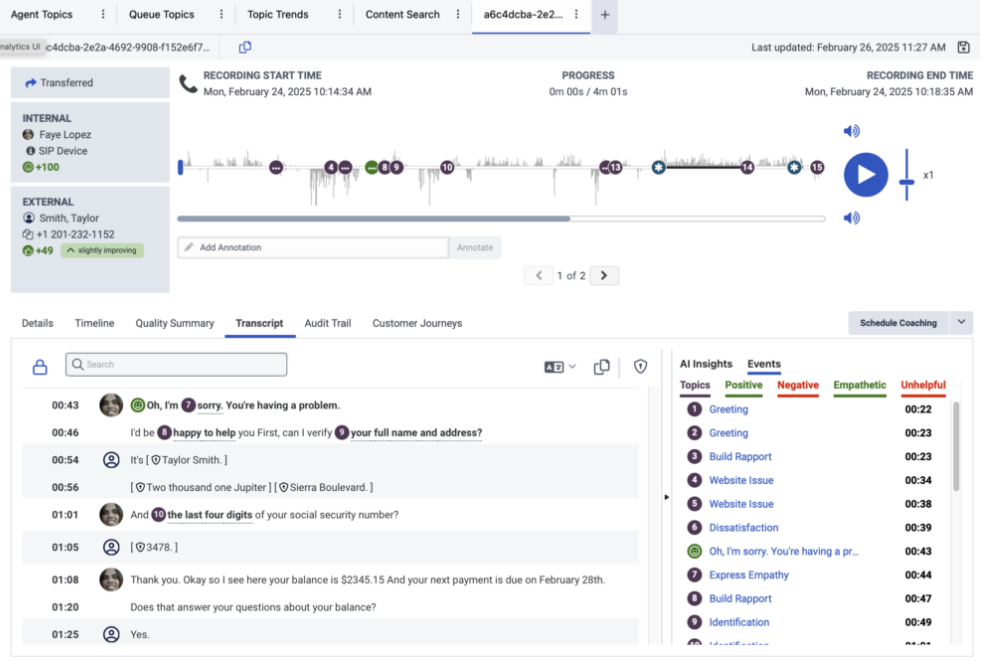 センチメントマーカーは、インタラクション概要、トランスクリプトタブ、およびイベントパネルにあります。 詳細については、以下を参照してください。 インタラクションの概要を理解する および 音声トランスクリプトを理解する.