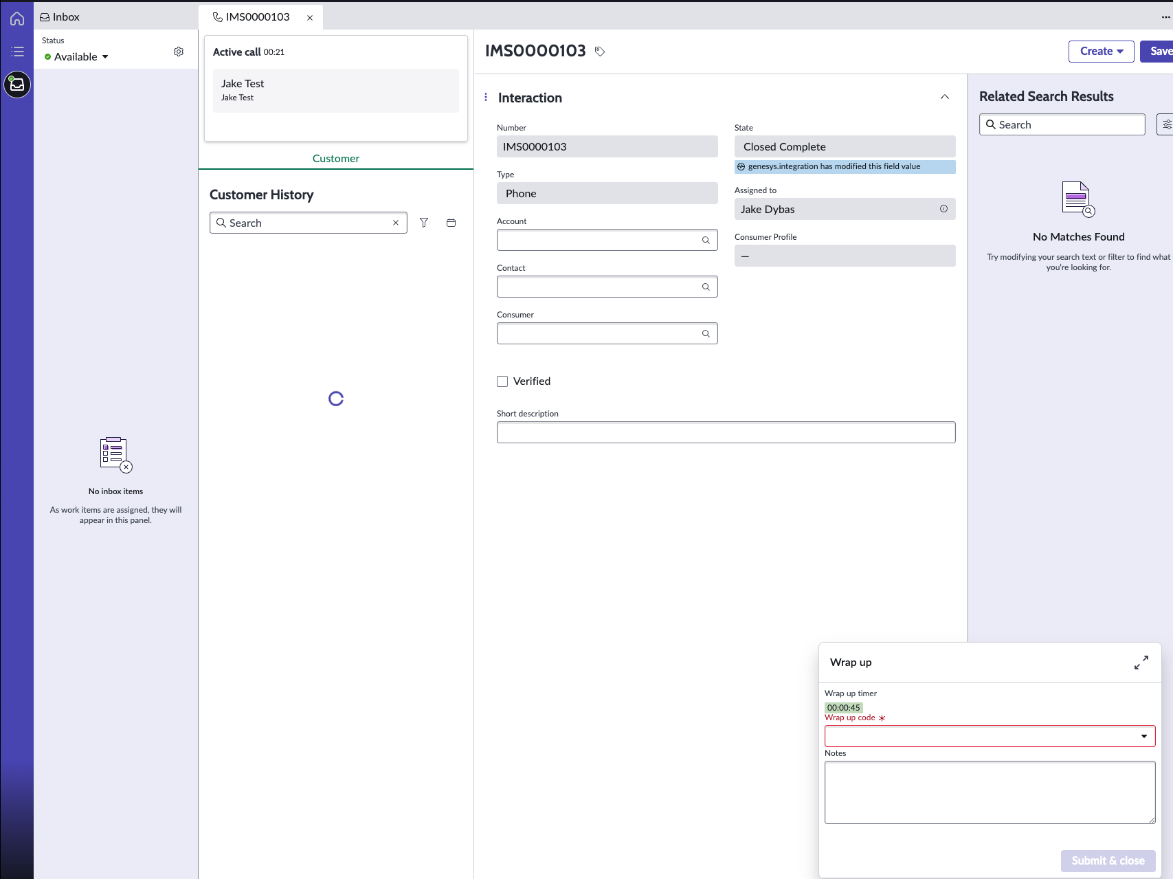 音声通話インタラクションのために Genesys Cloud を ServiceNow と統合すると、音声通話は Genesys Cloud から ServiceNow の適切なエージェントまたはキューにルーティングされます。音声通話情報は、 ServiceNow エージェント ワークスペース。この情報に加えて、キュー レベルで割り当てられた Genesys Cloud からのラップアップ コードも、ServiceNow の対応するキュー内のエージェントが利用できます。エージェントが音声通話を完了して通話を終了すると、ラップアップ モジュールが自動的に開き、対応する Genesys Cloud キューから取得されたラップアップ コードがラップアップ コード リストに表示されます。